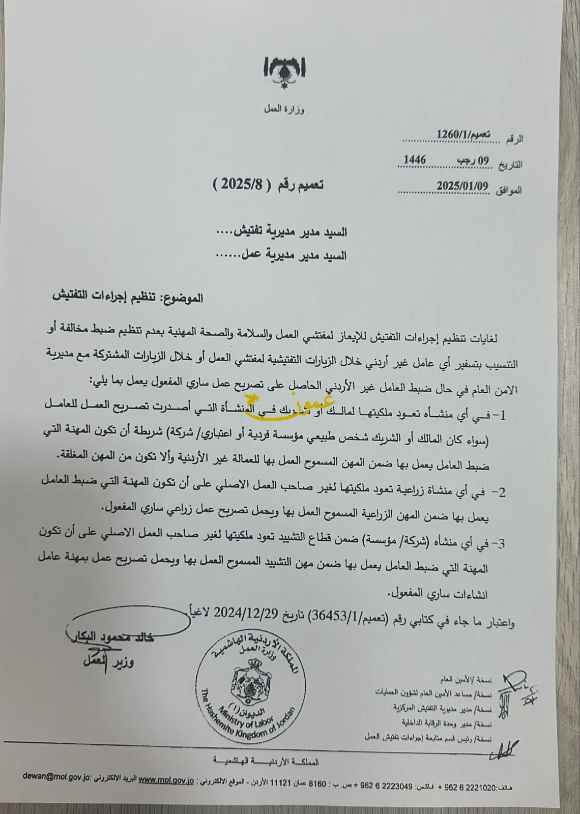 عمون - عمم وزير العمل خالد البكار اليوم الخميس، على مفتشي العمل والسلامة والصحة المهنية بعدم تنظيم ضبط مخالفة أو التنسيب بتسفير أي عامل غير أردني خلال الزيارات التفتيشية لمفتشي العمل أو خلال الزيارات المشتركة مع مديرية الأمن العام، وذلك لغايات تنظيم اجراءات التفتيش