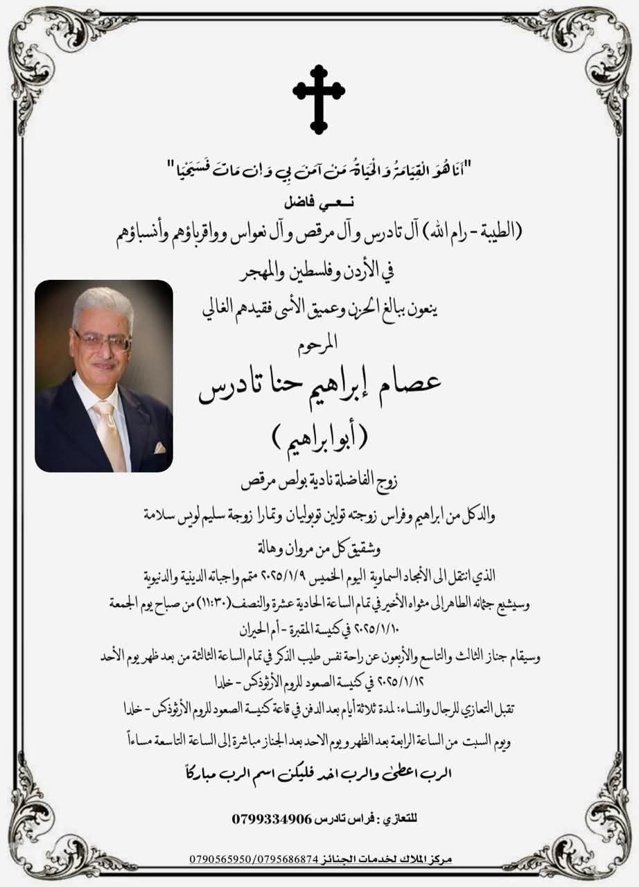 عمون - آل تادرس وآل مرقص وآل نعواس وواقرباؤهم وأنسباؤهم في الأردن وفلسطين والمهجر ينعون ببالغ الحزن وعميق الأسى فقيدهم الغالي المرحوم