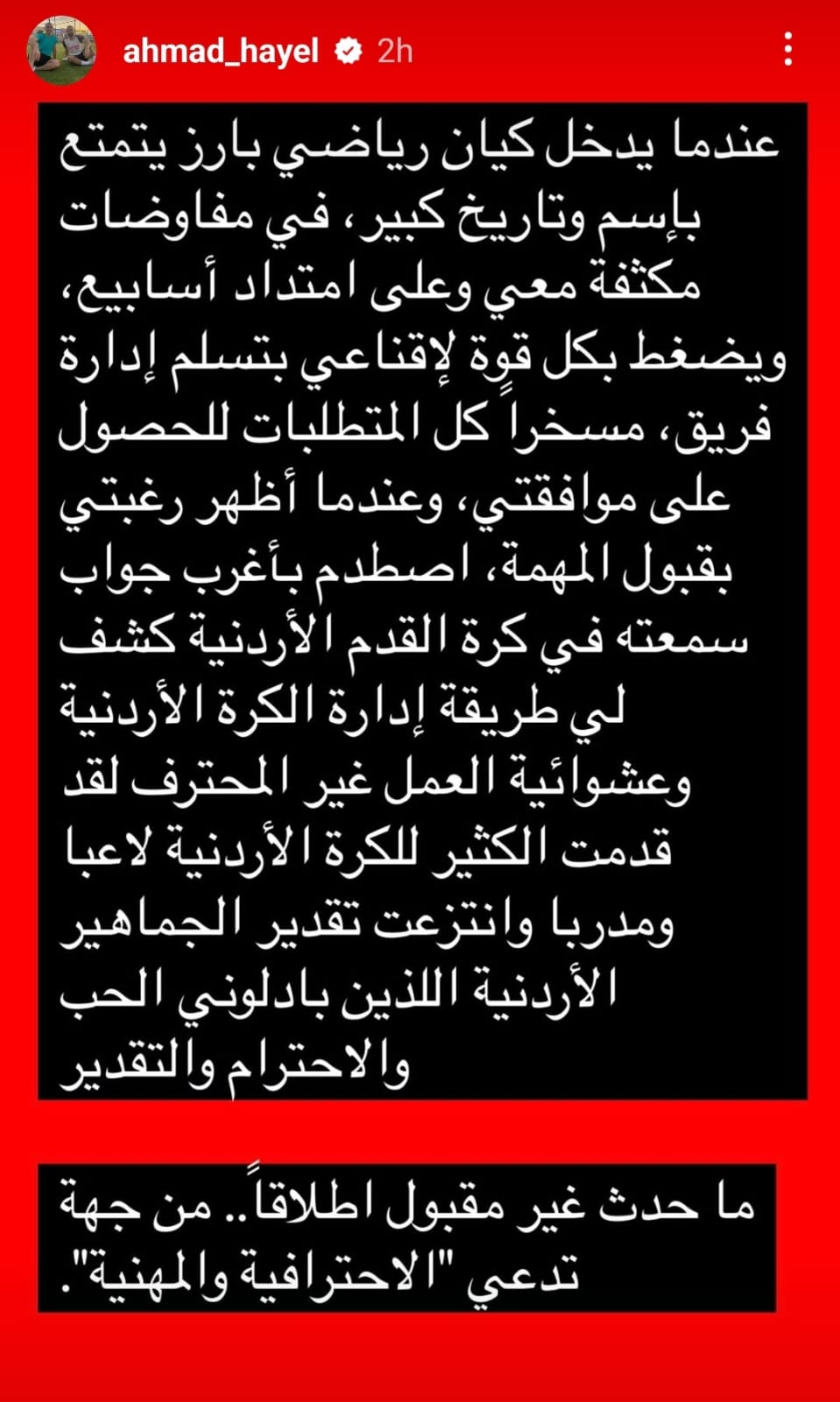 عمون - أكد المدرب الوطني أحمد هايل أن تصريحه عبر مواقع التواصل الاجتماعي، بخصوص أحد الأندية التي حاولت التعاقد معه وأخلفت في الاتفاق لاحقًا، لا يقصد به النادي الفيصلي. |