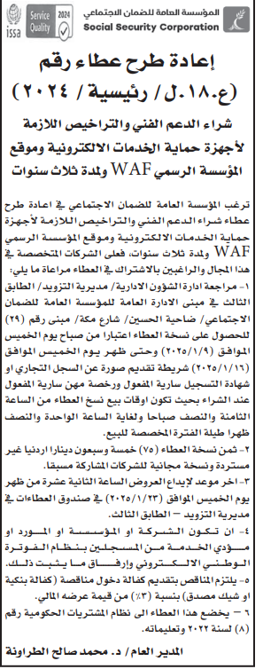 عطاء صادر عن المؤسسة العامة للضمان الاجتماعي