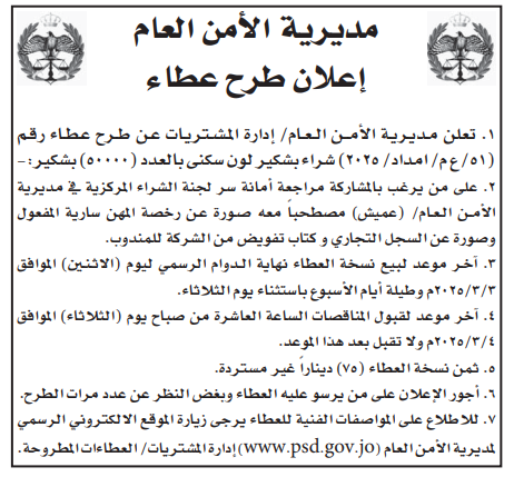 عطاء صادر عن مديرية الامن العام