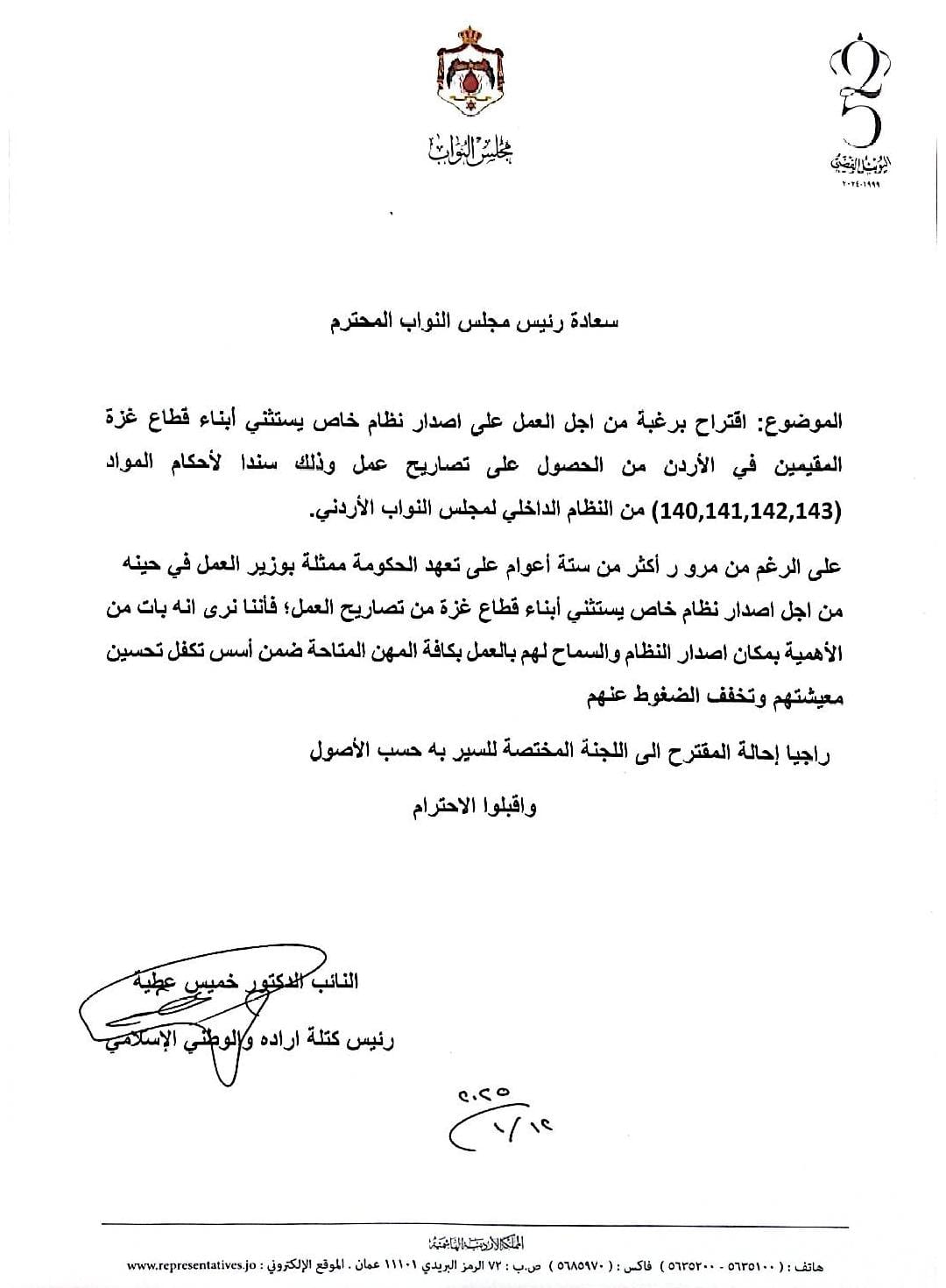 عمون - طالب النائب خميس عطية بالعمل بإصدار نظام خاص يستثني أبناء قطاع غزة المقيمين في الأردن من الحصول على تصريح عمل. |