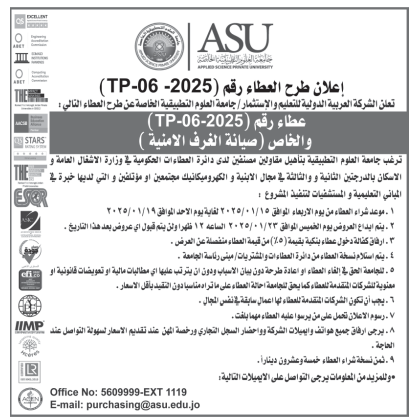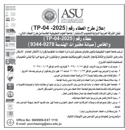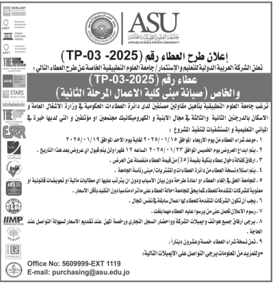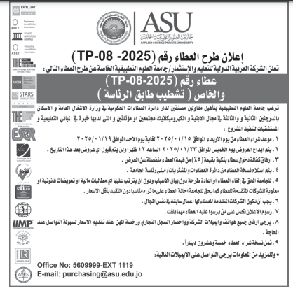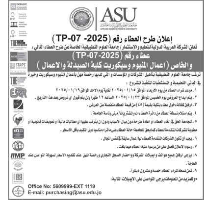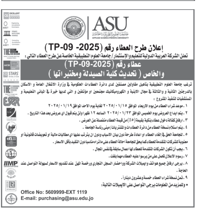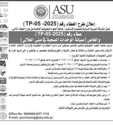 عطاءات صادرة عن جامعة العلوم التطبيقية الخاصة