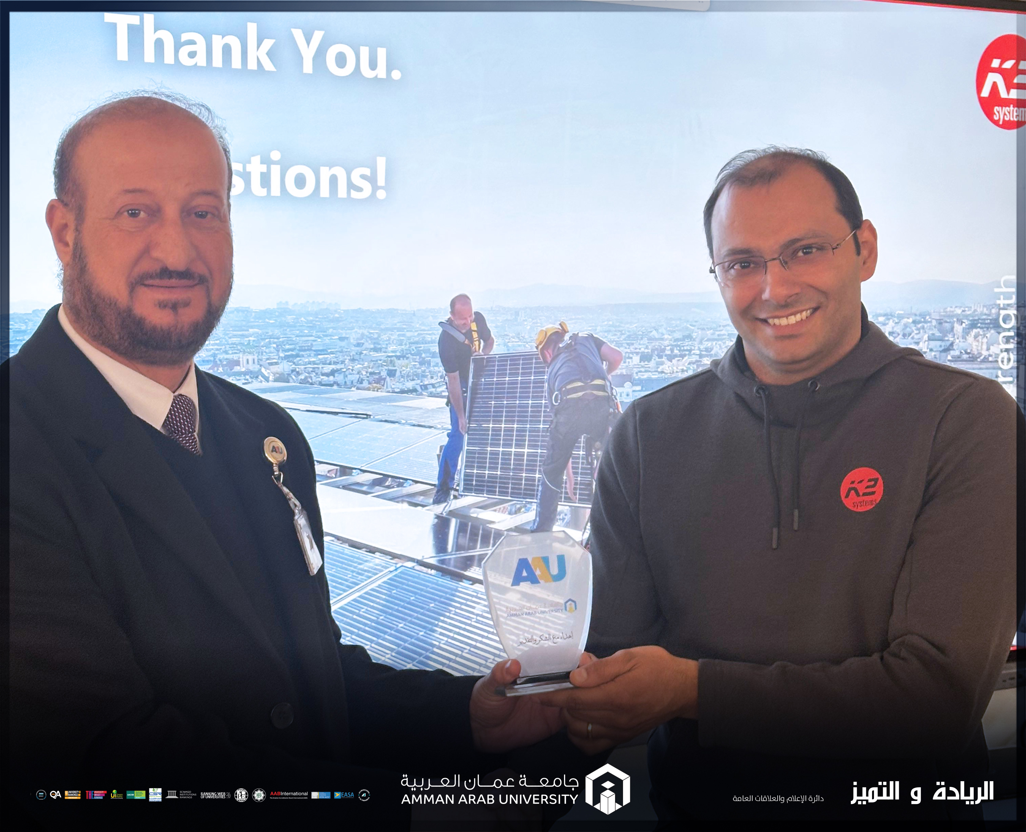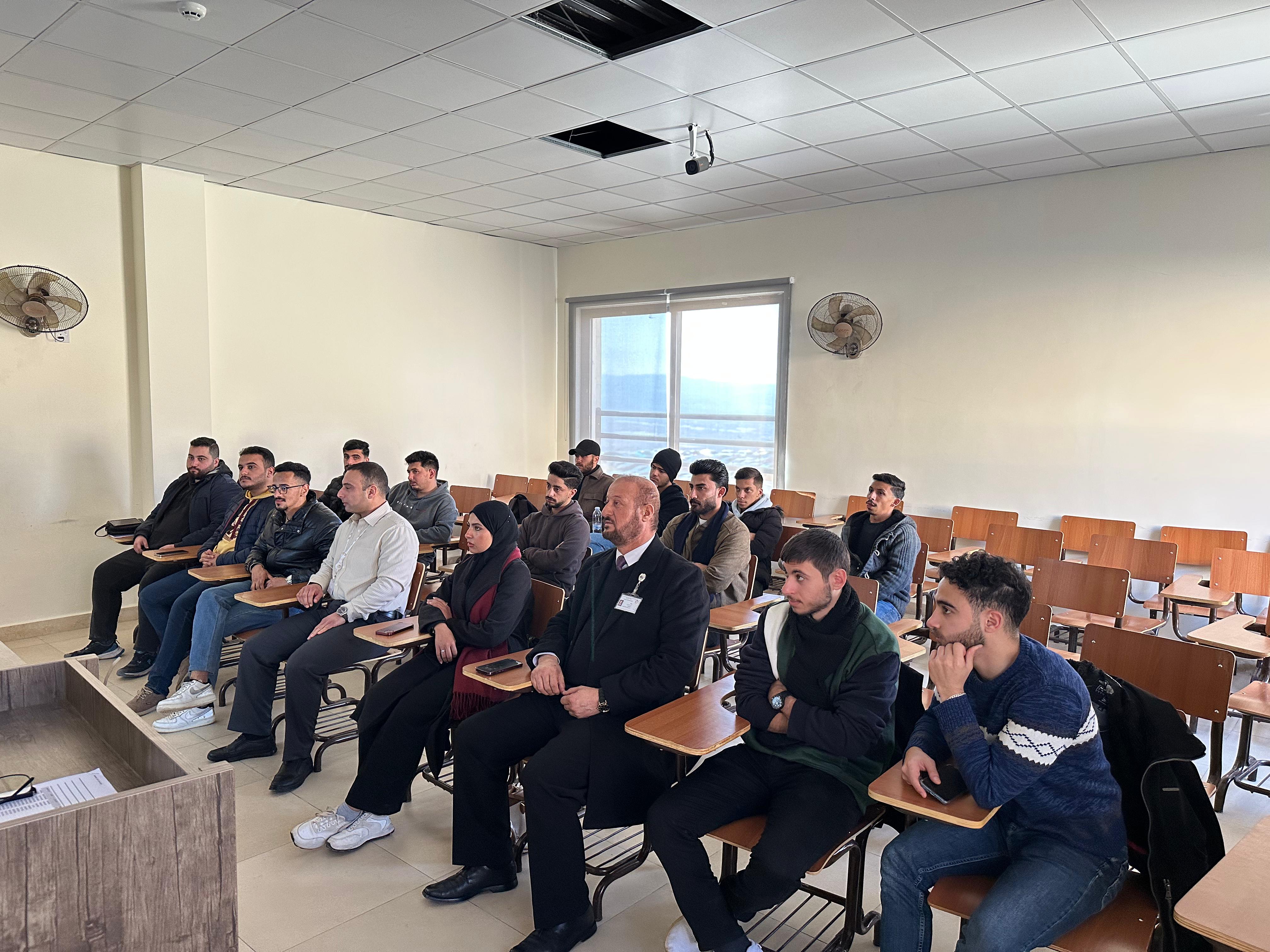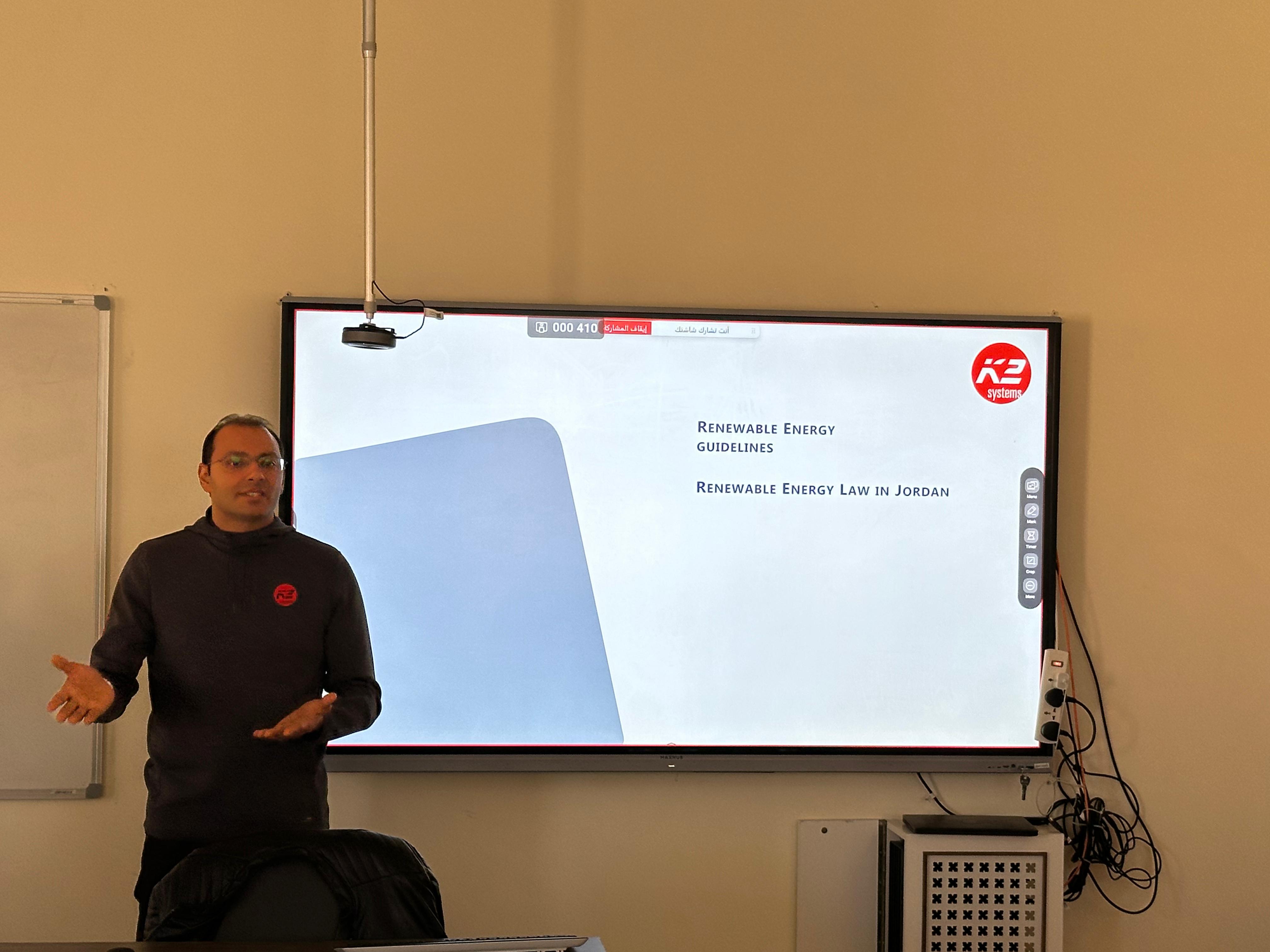 عمون - تنفيذاً لتوجيهات رئيس جامعة عمان العربية الاستاذ الدكتور محمد الوديان وضمن جهود الجامعة لتعزيز الجانب التطبيقي لدى طلبة قسم هندسة الطاقة المتجددة وربطهم بمتطلبات سوق العمل والاطلاع على أحدث التطورات التكنولوجية، وبرعاية من عميد كلية الهندسة الدكتورمالك السالم وبإشراف رئيس قسم هندسة الطاقة المتجددة الدكتور أكرم موسى، استضاف القسم المهندس مهند صويص مدير مبيعات الشرق الأوسط وشمال افريقيا لشركة K2 Systems الألمانية.