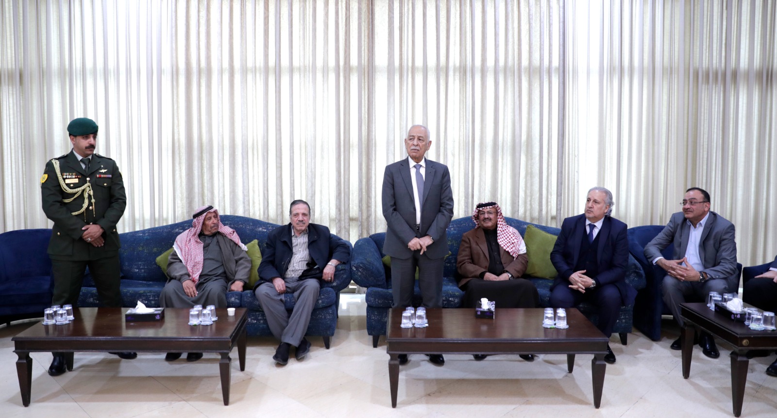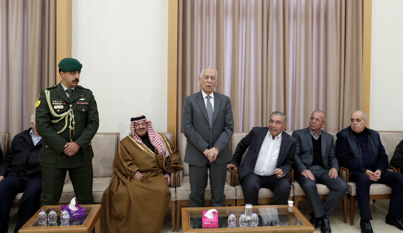عمون - مندوبا عن جلالة الملك عبدالله الثاني، وسمو الأمير الحسين بن عبدالله الثاني، ولي العهد، قدم رئيس الديوان الملكي الهاشمي يوسف حسن العيسوي، اليوم الثلاثاء، واجب العزاء إلى عشيرة الحوراني بوفاة العميد الطيار المتقاعد عبدالله محمد الحوراني، وإلى عشيرة أبو عبيد بوفاة الإعلامي محمود سليم أبو عبيد. |