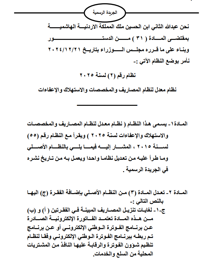 عمون - صدر في عدد الجريدة الرسمية الخميس، نظام معدل لنظام المصاريف والمخصصات والاستهلاك والاعفاءات لسنة 2024.