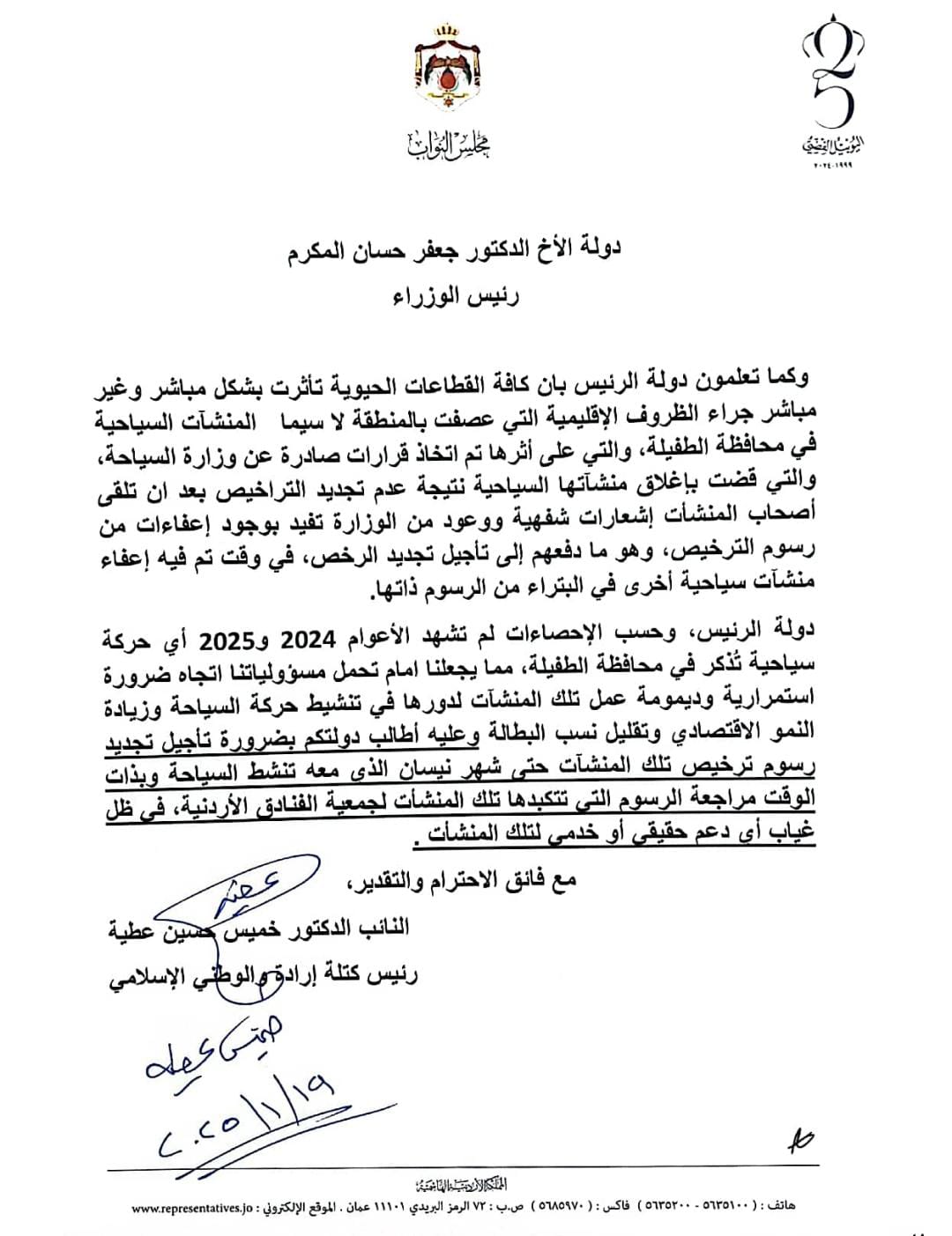 عطية يطالب بتأجيل رسوم ترخيص المنشآت السياحية في الطفيلة19-01-2025 01:47 PM
