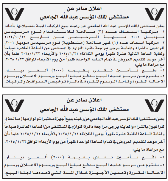 عطاءات صادرة عن مستشفى الملك المؤسس عبدالله الجامعي