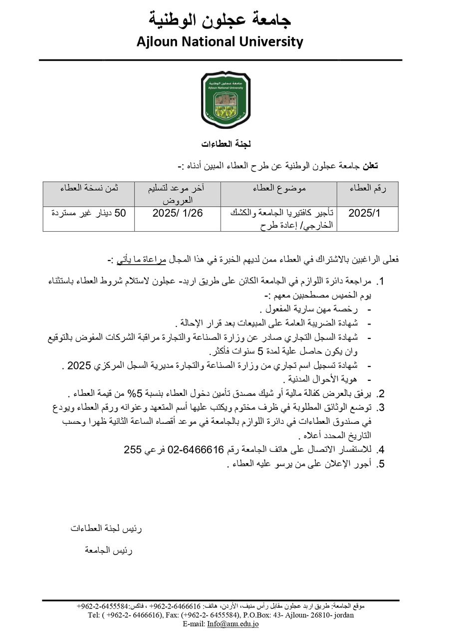 عطاء صادر عن جامعة عجلون الوطنية