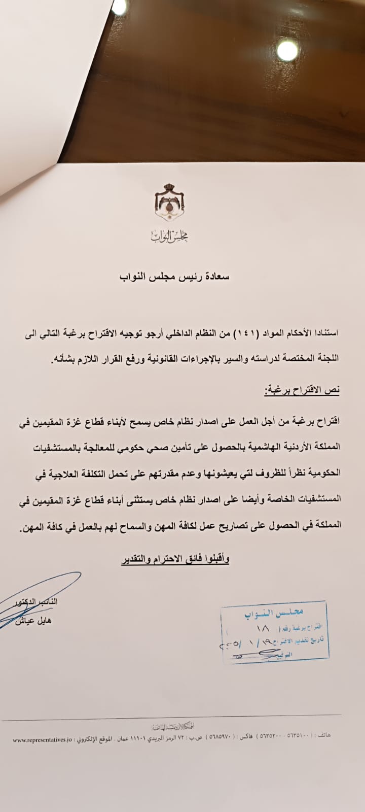 عمون - تقدم النائب هايل عياش باقتراح إلى اللجنة المختصة من أجل العمل على إصدار نظام خاص يسمح لأبناء قطاع غزة المقيمين في الأردن بالحصول على تأمين صحي حكومي من أجل الحصول على العلاج في المستشفيات الحكومية. |
