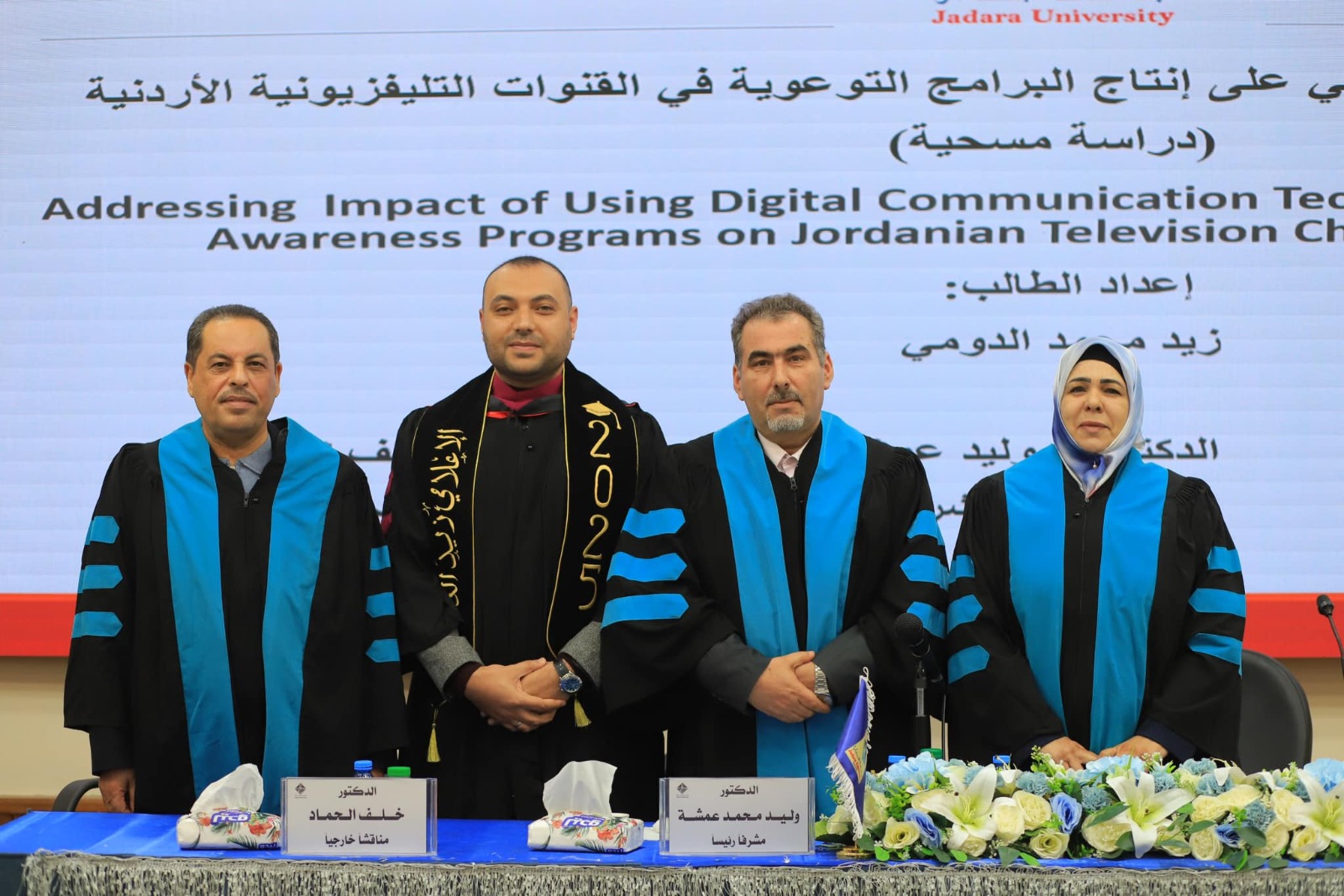 عمون - يتقدم الاهل والأصدقاء بأسمى آيات التهنئة والتبريكات للاستاذ زيد الدومي بمناسبة حصوله على درجة الماجستير في الاعلام من جامعة جدارا. وذلك بعد مناقشة رسالته التي جاءت تحت عنوان: "تأثير استخدام تقنيات الاتصال الرقمي على إنتاج البرامج التوعوية في القنوات التليفزيونية الأردنية" وبإشراف الدكتور وليد عمشة |