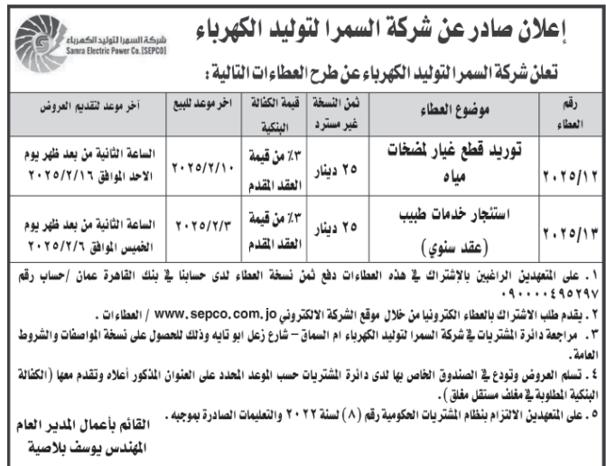 عطاءات صادرة عن شركة السمرا لتوليد الكهرباء