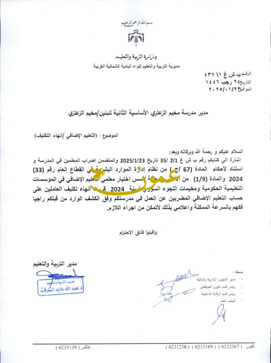 عمون - قرر مدير تربية البادية الشمالية الغربية عبدالله الشرفات، انهاء تكليف معلمي التعليم الاضافي في مخيم الزعتري .