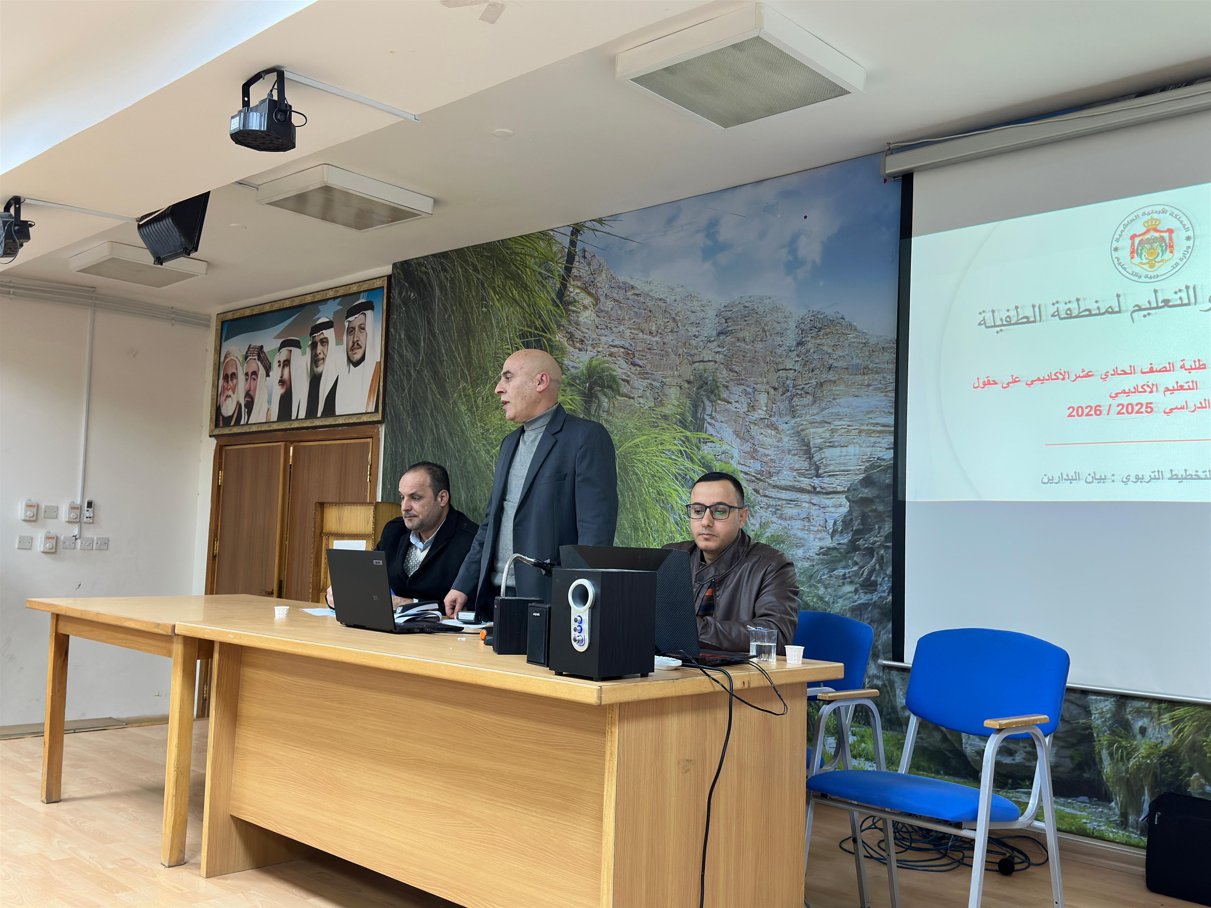 وتأتي هذه الورشة الهامة من تنظيم وتنسيق قسمي التخطيط التربوي ممثلًا برئيسة القسم السيدة منال العوران وعضو القسم الأستاذة بيان البدارين و قسم الامتحانات والاختبارات ممثلًا برئيس القسم الأستاذ هاني الحوامدة وعضو القسم الأستاذ المبرمج أحمد المرايات وعضو القسم هشام الزيدانيين وذلك لعددٍ من مديري ومديرات المدارس التابعة لمنطقة الطفيلة وذلك للمساهمة في نقل المعرفة إلى الطلاب والطالبات ممن هم معنيون باختيار حقولهم الدراسية وفق ما حددته وزارة التربية والتعليم.