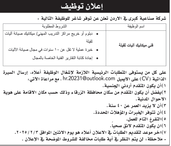 مطلوب فني ميكانيك للعمل لدى شركة صناعية كبرى