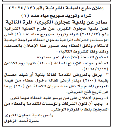 عطاء شراء صهريج مياه لبلدية عجلون