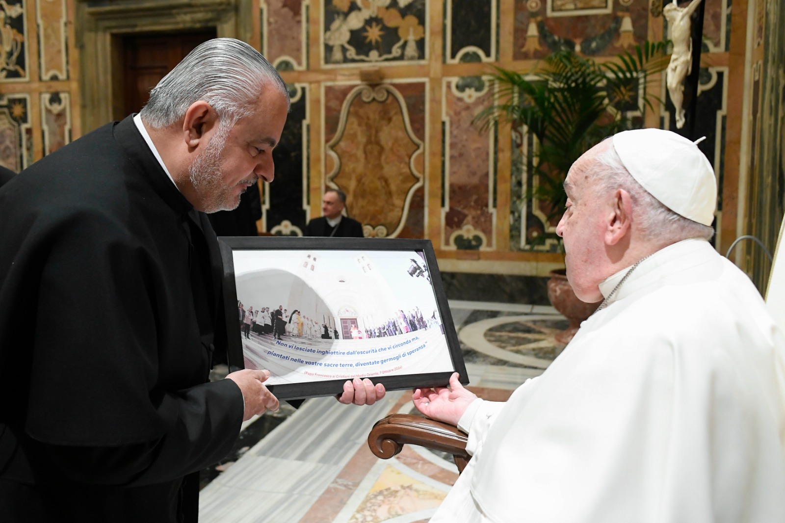 عمون - التقى الأب رفعت بدر اليوم الاثنين بالبابا فرنسيس، في القصر البابوي، وقدّم له لوحة عن تدشين كنيسة معموديّة السيّد المسيح الذي جرى في شهر كانون الثاني بحضور الكاردينال بيترو بارولين ممثلاً عن قداسة البابا، ومكتوبًا عليها ما قاله أيضًا البابا فرنسيس في رسالته إلى المسيحيين في الشرق الأوسط، في أكتوبر 2024، "أنتم أيها المسيحيون في الشرق مغروسون في أراضيكم المقدَّسة، وعليكم أن تكونوا دائماً براعم أمل ورجاء في مجتمعاتكم". كما اخبر الاب رفعت قداسة البابا عن المعرض الاردني الذي سيفتتح في الفاتيكان بعد أيام، ويحمل عنوان " الأردن فجر المسيحية" وتشرف عليه وزارة السياحة والآثار الأردنية وسيستمر حتى نهاية شهر شباط. |
