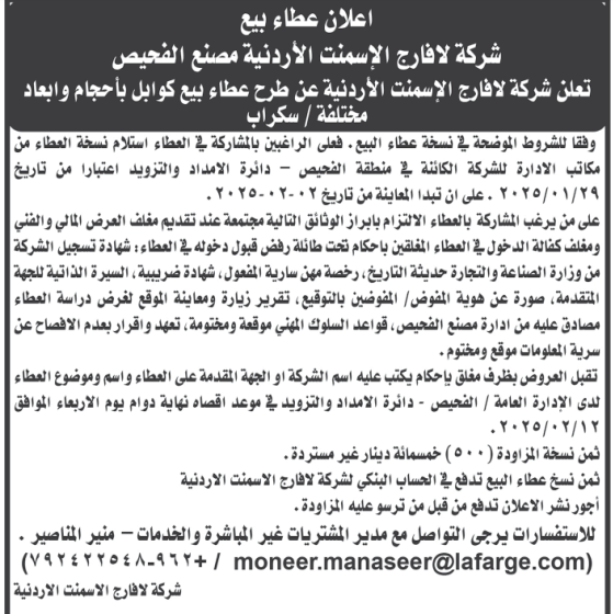 عطاء صادر عن شركة لافارج الاسمنت الاردنية