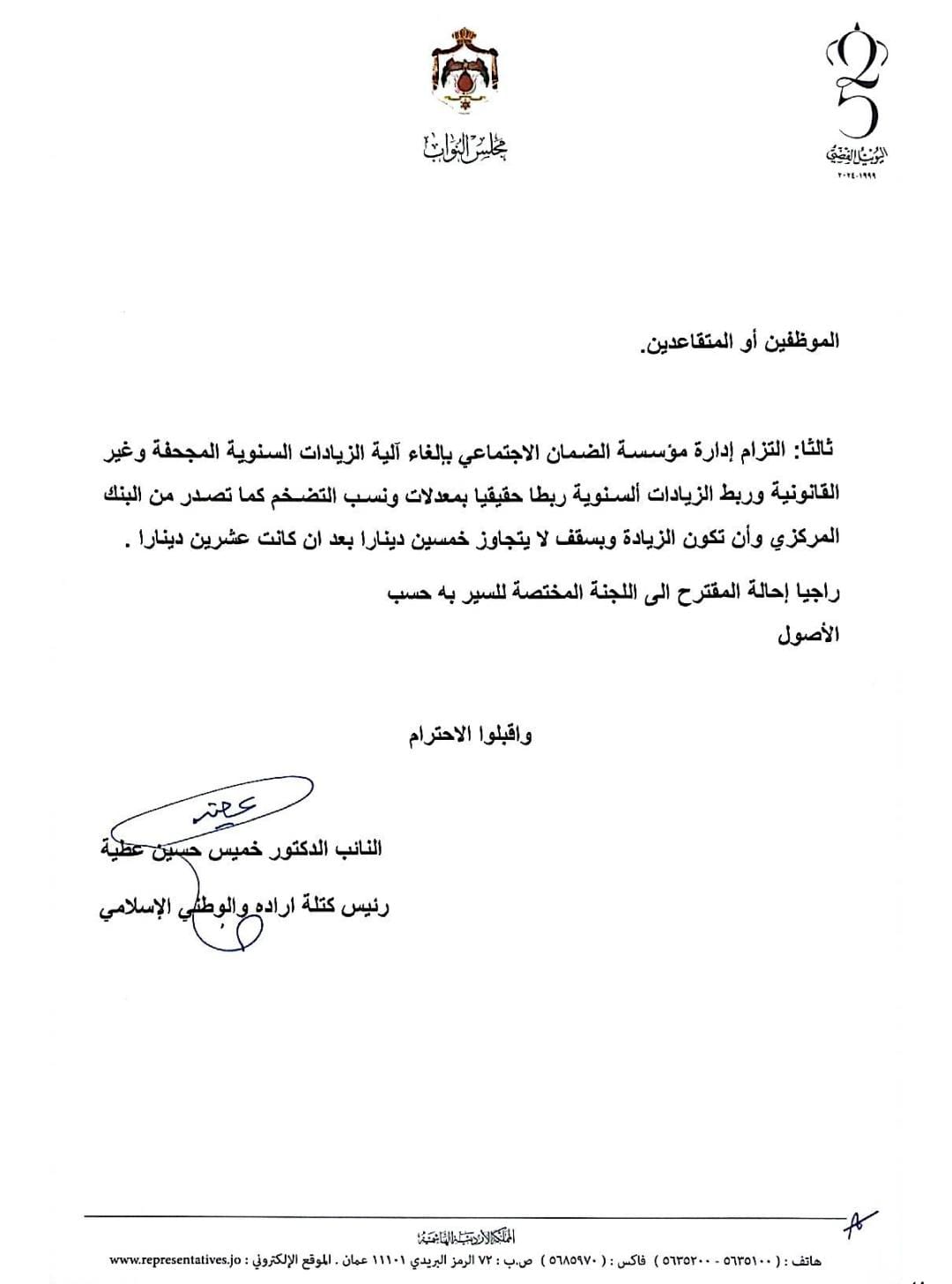 التزام مؤسسة الضمان الاجتماعي بتعديل آلية الزيادات السنوية: دعا النائب إلى إلغاء الآليات الحالية التي وصفها بـ"المجحفة"، وطالب بربط الزيادات السنوية بمعدلات التضخم المعلنة من البنك المركزي، على أن تكون الزيادة بحد أقصى 50 دينارًا بدلاً من الحد الحالي البالغ 20 دينارًا.