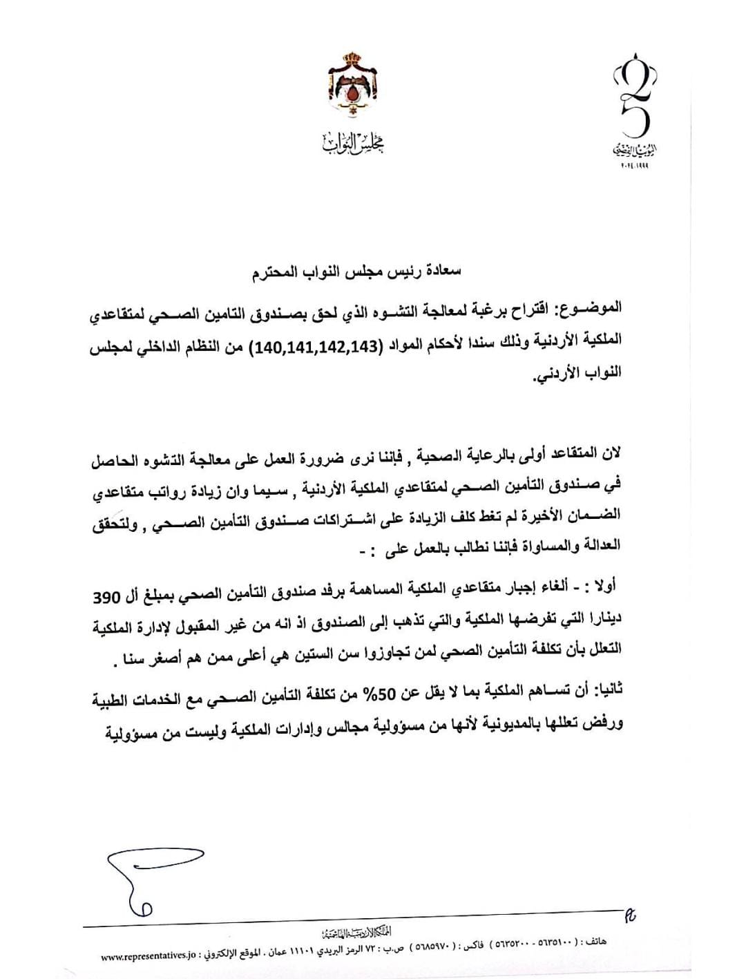 إلغاء إجبار متقاعدي الملكية على دفع 390 دينارًا لصندوق التأمين الصحي: حيث أوضح أن هذه المساهمة الإجبارية غير مبررة، خاصة أن إدارة الملكية تتعلل بارتفاع كلفة التأمين الصحي لمن تجاوزوا سن الستين.
