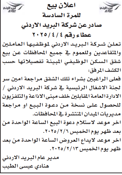 عطاء صادر عن شركة البريد الاردني