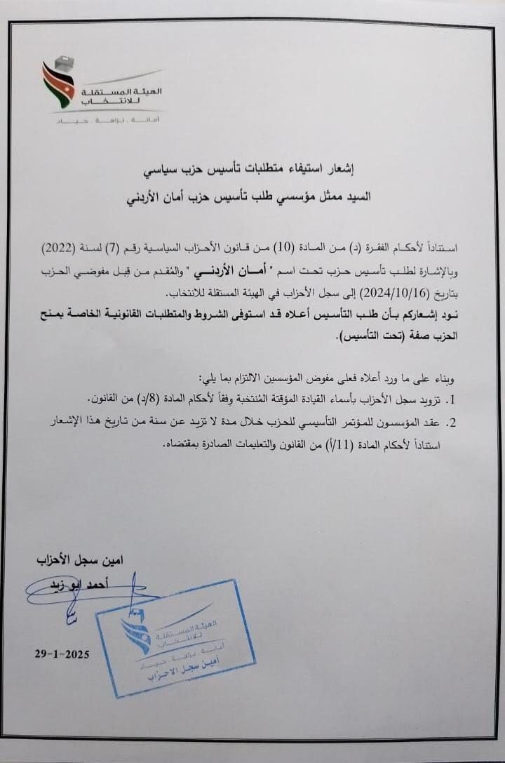 عمون - أعلن جزب "أمان الأردني" عن استلام إشعار التأسيس الرسمي من وحدة الأحزاب في الهيئة المستقلة للانتخابات، ليكون بذلك قد قطع مرحلة هامة في طريق تأسيسه كحزب سياسي.