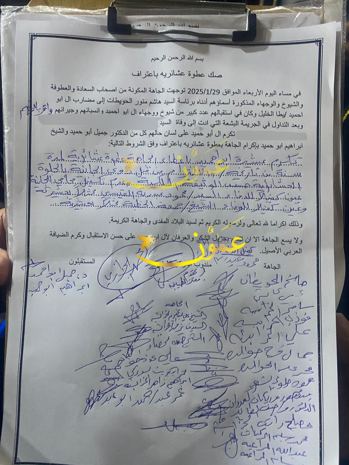 عطوة سنة وجلوة عشائرية لذوي قاتلة زوجها حرقًا (وثيقة وصور)29-01-2025 06:29 PM