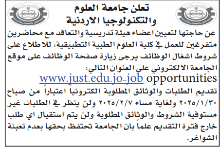 جامعة العلوم والتكنولوجيا الاردنية بحاجة لتعيين اعضاء هيئة تدريسية