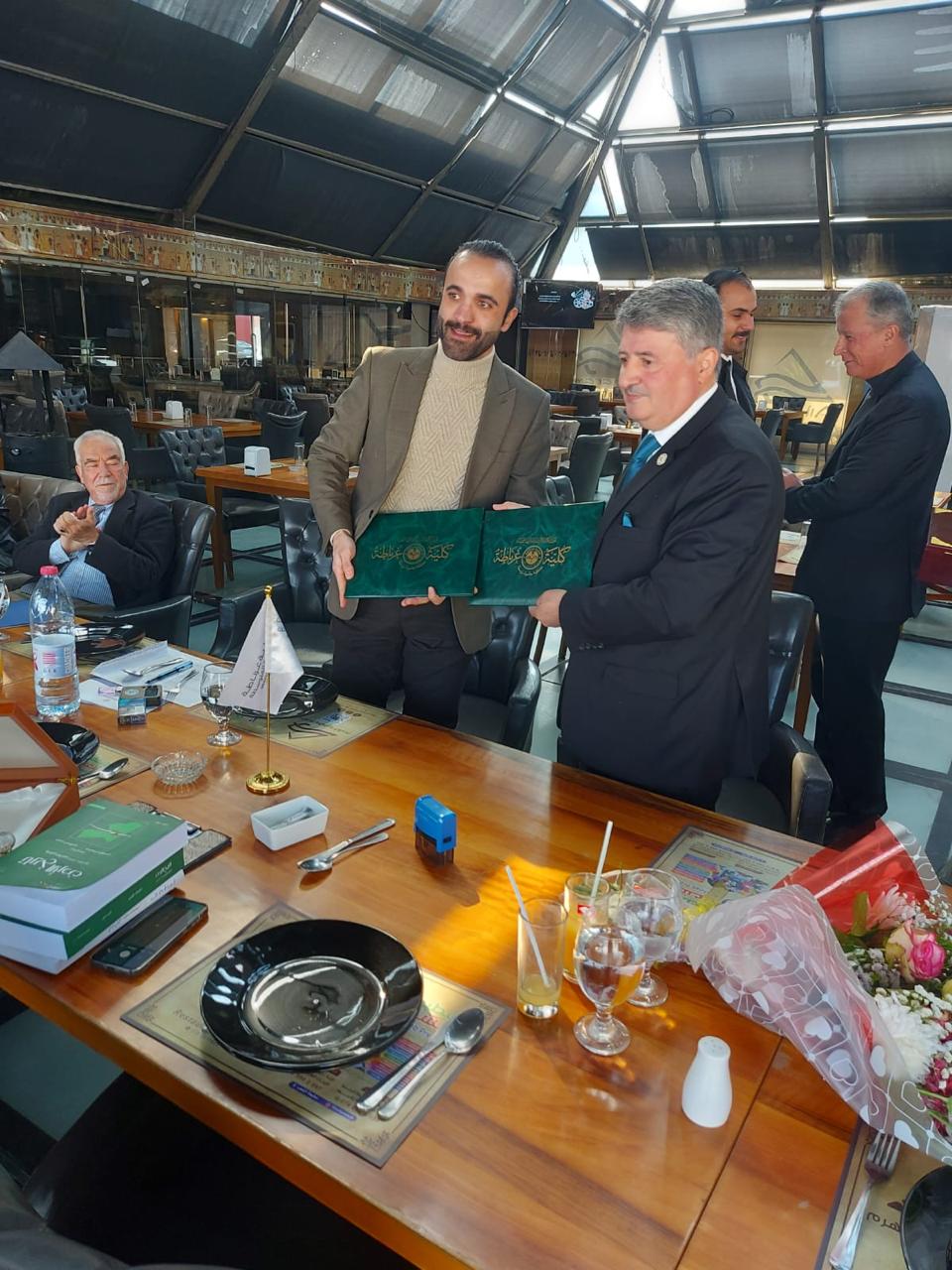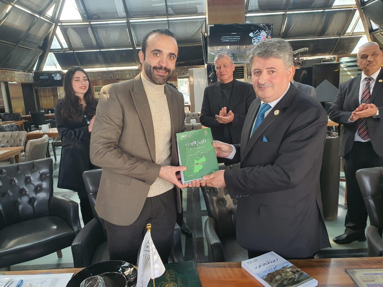 وبعد إنتهاء مراسم التوقيع تبادل العزام والعبيدات الدروع التذكارية بهذه المناسبة كما قدم العزام للعبيدات مقتنيات مكتبة الجمعية (مكتبة المؤرخ سليمان الموسى)نسخة عن كتاب "تاريخ الأردن من عام 1900-عام 1995" تأليف سليمان الموسى ومنيب الماضي،ونسخة أخرى من كتاب غربيون في بلاد العرب.