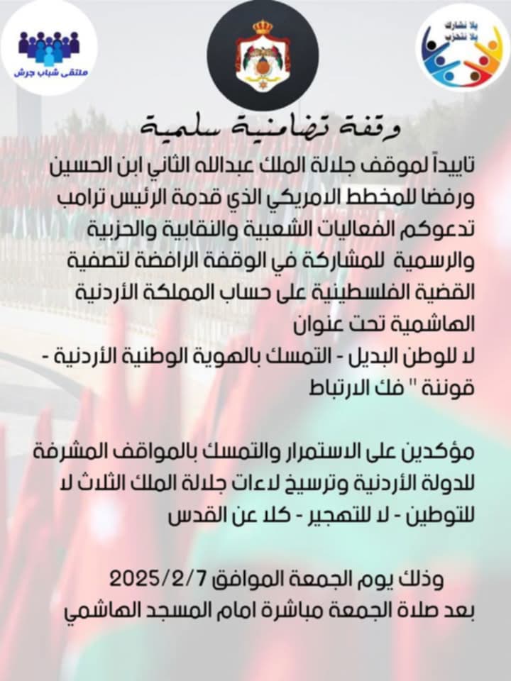 عمون - دعا أبناء محافظة جرش، إلى تلبية نداء الوطن والمشاركة في مسيرة انتماء وولاء غدًا الجمعة الموافق 7/2/2025 بعد صلاة الجمعة من المسجد الهاشمي. |