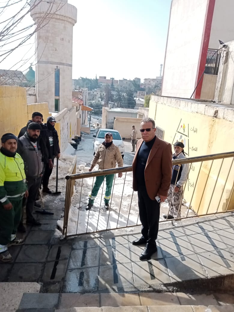 وتجول خلال الجولة في ساحات المدرستين للتأكد من سلامتها بالنسبة للطلبة ، حيث باشرت مديرات المدارس بالتعاون مع بلدية القادسية منذ الصباح الباكر في إزالة الثلوج المتراكمة لضمان سلامة الطلبة .
