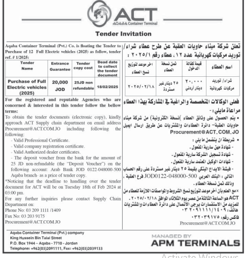 عطاء صادر عن شركة ميناء حاويات العقبة