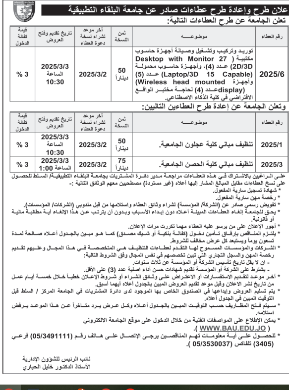 عطاءات صادرة عن جامعة البلقاء التطبيقية