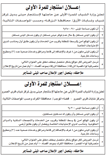 عطاء استئجار مبنى بديل لمركز شباب وشابات الازرق