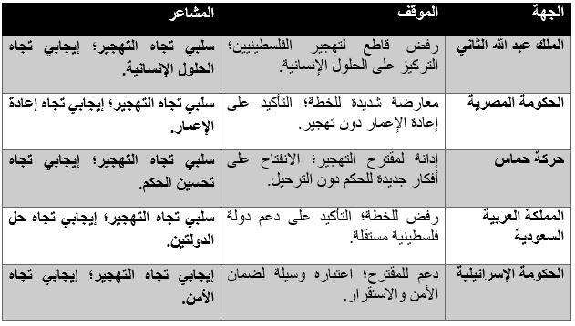 يعكس هذا الجدول تنوع المشاعر والمواقف بين الأطراف المختلفة، مما يبرز التعقيدات الدبلوماسية المحيطة بالمقترح وتأثيره المحتمل على استقرار المنطقة.