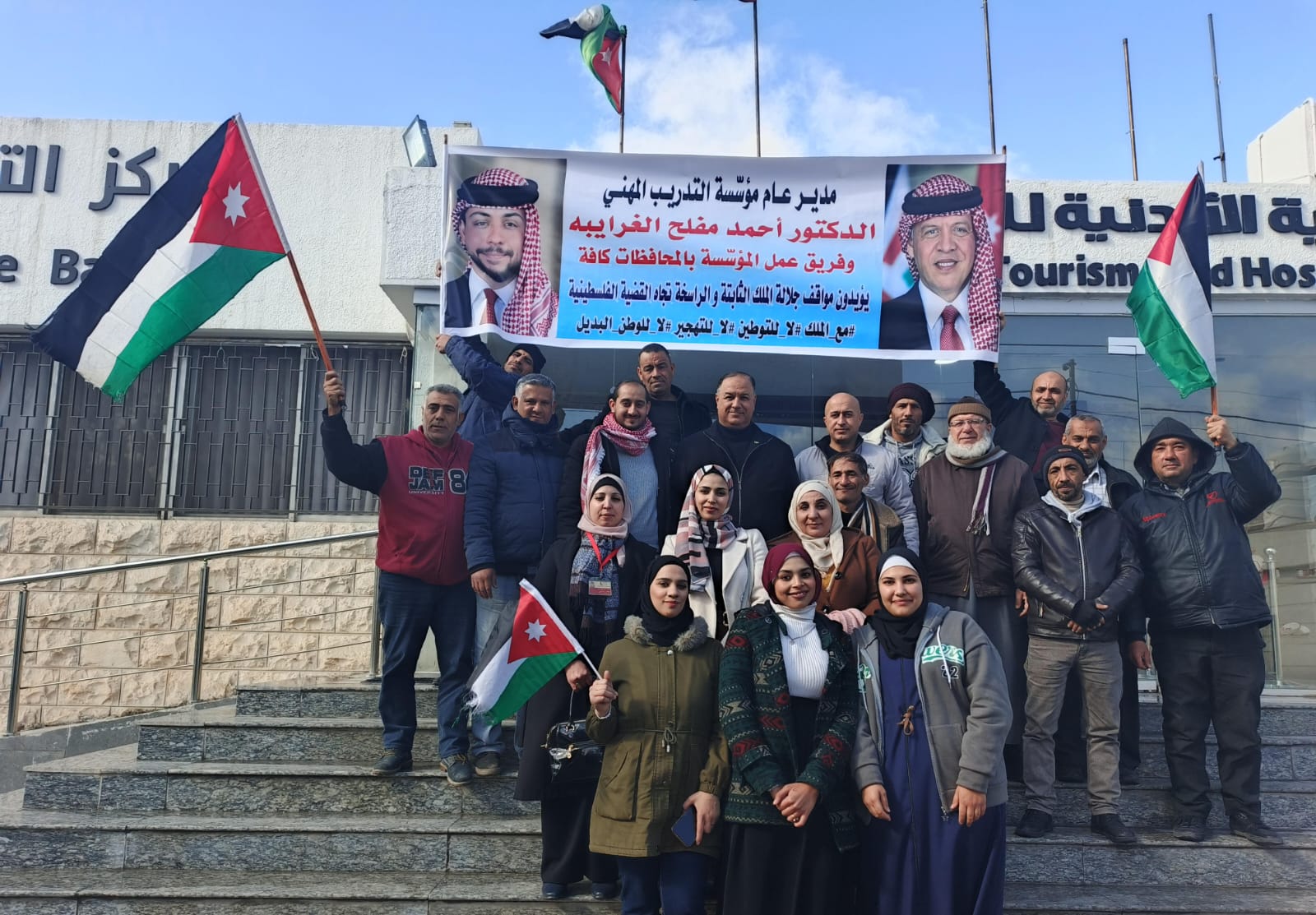 هذا وقد تشكلت غرفة عمليات لغايات المتابعة بهذا الخصوص في الأكاديمية الأردنية للسياحة والفندقة، حيث انطلقت أكثر من 15 حافلة تضم الموظفين والمدربين والمتدربين من معاهد المؤسّسة باتجاه موقع الاستقبال الملكي متزينة بالأعلام الأردنية وتحمل يافطات تتضمن عبارات الولاء والتأييد للعرش الهاشمي وتشيد بمواقف جلالة الملك القومية والوطنية خاصة بما يتعلق بالقضية الفلسطينية ورفض التهجير و التوطين وتؤكد التفاف مختلف أبناء وبنات الوطن خلف قيادتهم الهاشمية.