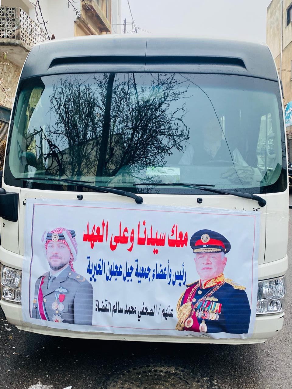 عمون - شاركت جمعية جبل عجلون الخيرية ابناء محافظة عجلون والاردنيون أفراحهم باستقبال جلالة الملك عبدالله الثاني وولي العهد في مطار ماركا. |