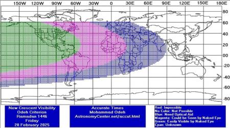 وقال مدير مركز الفلك الدولي، محمد شوكت عودة، في بيان الجمعة: "ستتحرى دول العالم الإسلامي هلال شهر رمضان 1446 هـ يوم الجمعة 28 فبراير 2025م، ورؤية الهلال في ذلك اليوم ممكنة باستخدام التلسكوب من غرب آسيا ومعظم أفريقيا وجنوب أوروبا، وهي ممكنة بالعين المجردة من أجزاء واسعة من القارتين الأمريكيتين، وحيث أن هناك إمكانية لرؤية الهلال من العالم الإسلامي يوم الجمعة، ونظرا لحدوث الاقتران قبل غروب الشمس وغروب القمر بعد غروب الشمس في جميع مناطق العالم الإسلامي، فقد جرت العادة بمثل هذه الظروف أن تعلن غالبية دول العالم الإسلامي بدء الشهر في اليوم التالي، وعليه من المتوقع إعلان معظم دول العالم الإسلامي غرة شهر رمضان المبارك يوم السبت 01 مارس/ اذار".