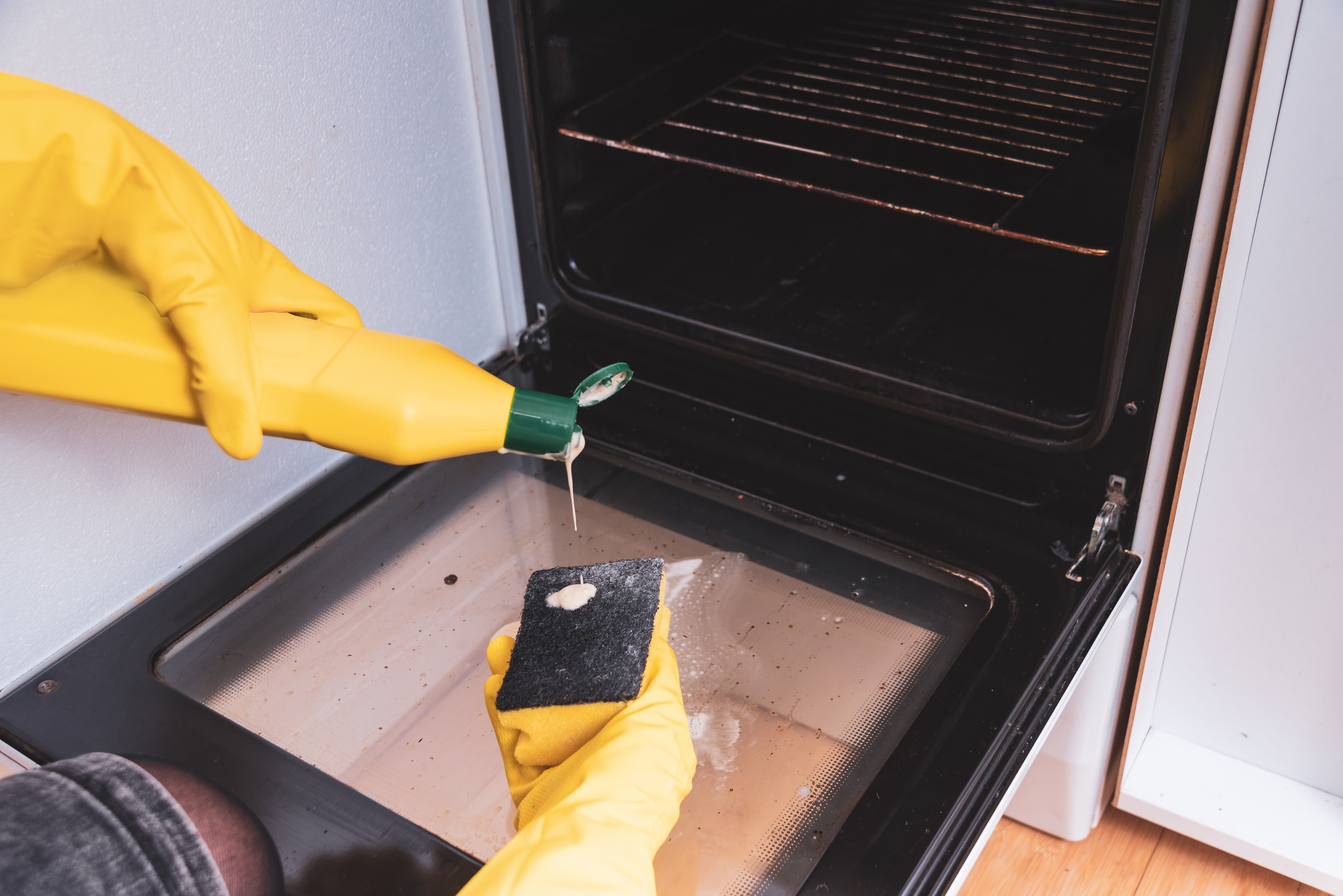 اتركي الفرن منقوعاً بالمحلول طوال الليل. في اليوم التالي، يجب أن تكون رواسب الدهون قد انفصلت وبدأت في الانزلاق إلى أرضية الفرن.