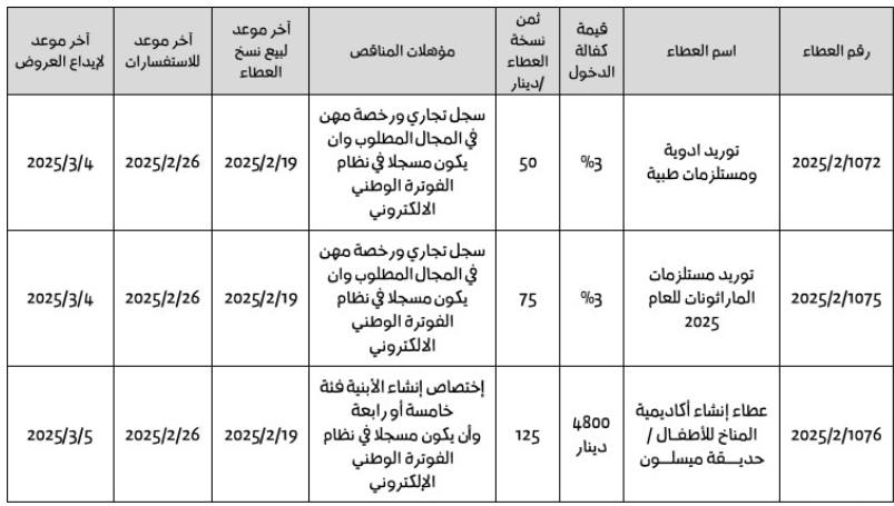 عمون - أعلنت أمانة عمان الكبرى عن طرح عدد من العطاءات، داعية على الراغبين بالاشتراك في هذه العطاءات مراعاة ما يلي: