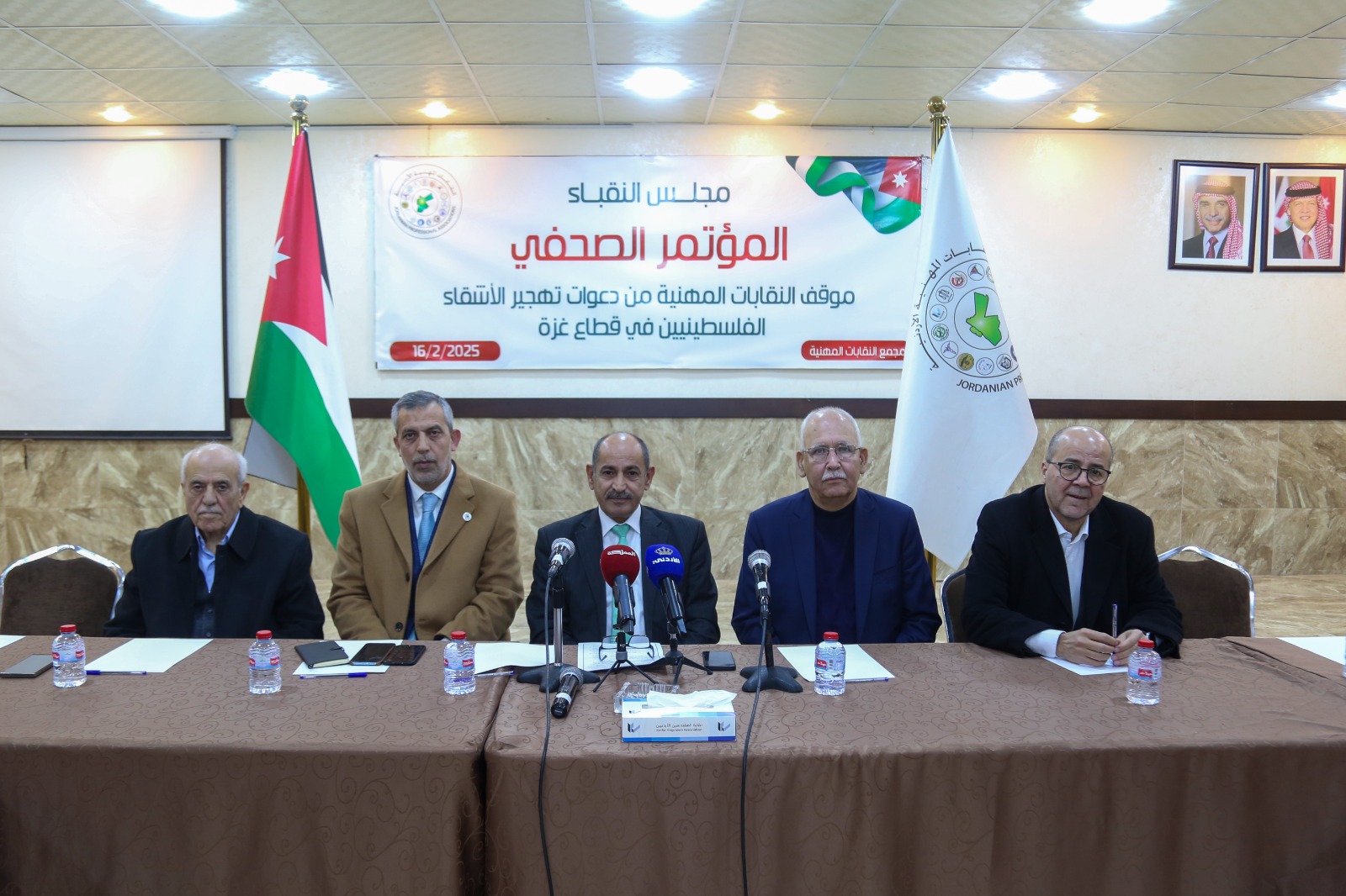 وأكد المجلس في مؤتمر صحفي عقده رئيس مجلس النقباء نقيب المهندسين الزراعيين م.علي ابونقطة، بحضور نقيب المهندسين م.احمد سمارة الزعبي ونقيب المحامين يحيى ابوعبود ونقيب الاطباء الدكتور زياد الزعبي ونقيب الممرضين خالد ربابعة، وقوفه خلف القيادة الهاشمية وتأييده للموقف الأردني الواضح والصلب في رفض "الخطة المجنونة" للرئيس الأمريكي في تهجير أهلنا من غزة إلى الأردن ومصر.