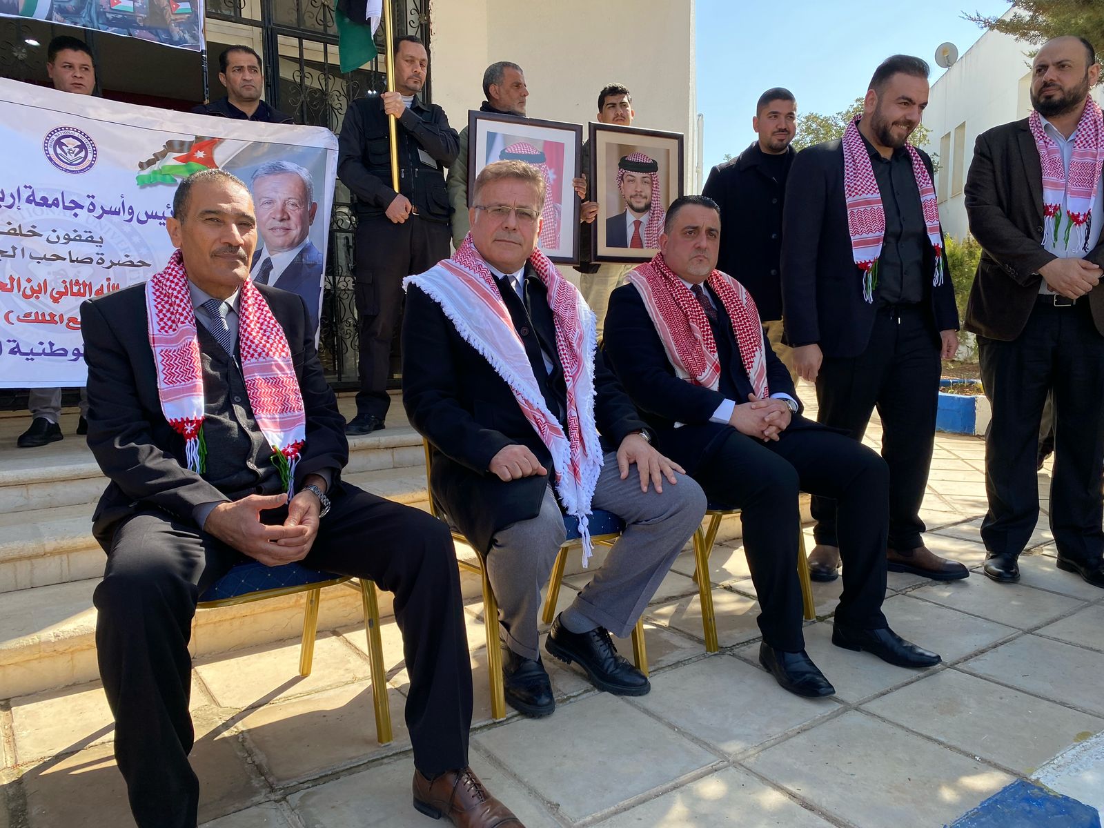 وأضاف، إننا، في جامعة إربد الأهلية، أكاديميين وإداريين وطلبة، نَقف اليوم موقفًا صادقًا مع قائدنا، الذي جَعل من الثوابت الأردنية خطًا أحمر لا يُساوَم عليه، فنُجدد عَهدنا وولاءنا له، ونُعاهده بأن نبقى صفًا واحدًا خَلف القيادة الهاشمية الحكيمة، مدافعين عن أمن الأردن واستقراره، رافضين أي محاولات للمساس بسيادتنا الوطنية أو هويتنا العربية والإسلامية، وإن مواقف جلالة الملك المشرفة في الدفاع عن الحق الفلسطيني، ورفضه القاطع لمشاريع التهجير والتوطين، تؤكد بأن الأردن كان وسيبقى السَند الأول لفلسطين، وأن الوصاية الهاشمية على المقدسات الإسلامية والمسيحية في القدس الشريف، هي التزامٌ تاريخيٌّ لا يقبل المساومة، وإن وقفتنا اليوم ليست مجرد فعاليةٍ رمزية، بل هي رسالةٌ واضحة بأن الأردنيين جميعًا، بمختلف مواقعهم، يجددون البيعة والولاء، ويُؤكدون موقفهم الثابت في دعم جلالة الملك، الذي يَقفُ شامخًا في المحافل الدولية، مدافعًا عن قضايانا العادلة، ومنافحًا عن حقوق الأمة.