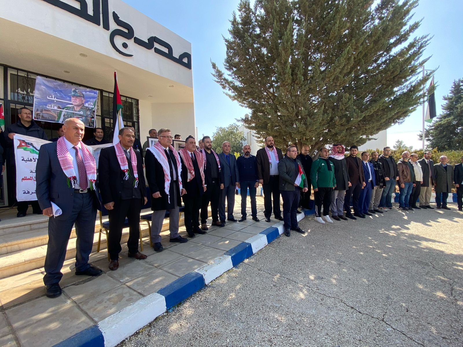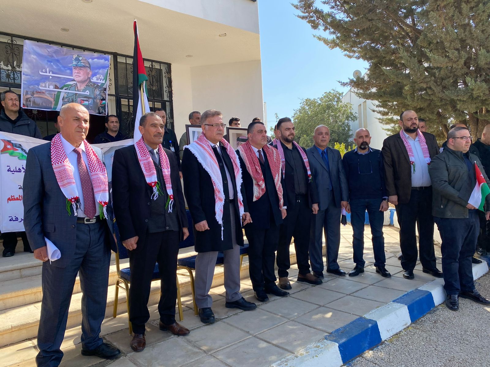 وأكد في كلمته أن مواقف جلالتهِ كانت وستبقى سفراً من أسفارِ المجدِ الأردني العربي الهاشمي، وشاهداً حياً وخالداً على ما غرسهُ ويغرسهُ الهاشميون فينا من تضحياتِ وقيمٍ ومبادئَ في الدفاعِ عن قضايا الوطنِ والأمة، وفي مقدِمتها القضيةُ الفلسطينية، التي كانت وستبقى قضيتُنا المركزية، واختتم كلمته أن يحفظ الله الأردن وأن يحفظ الله قائدنا حضرة صاحب الجلالة الملك عبد الله الثاني ابن الحسين المعظم، وولي عهده الأمين.