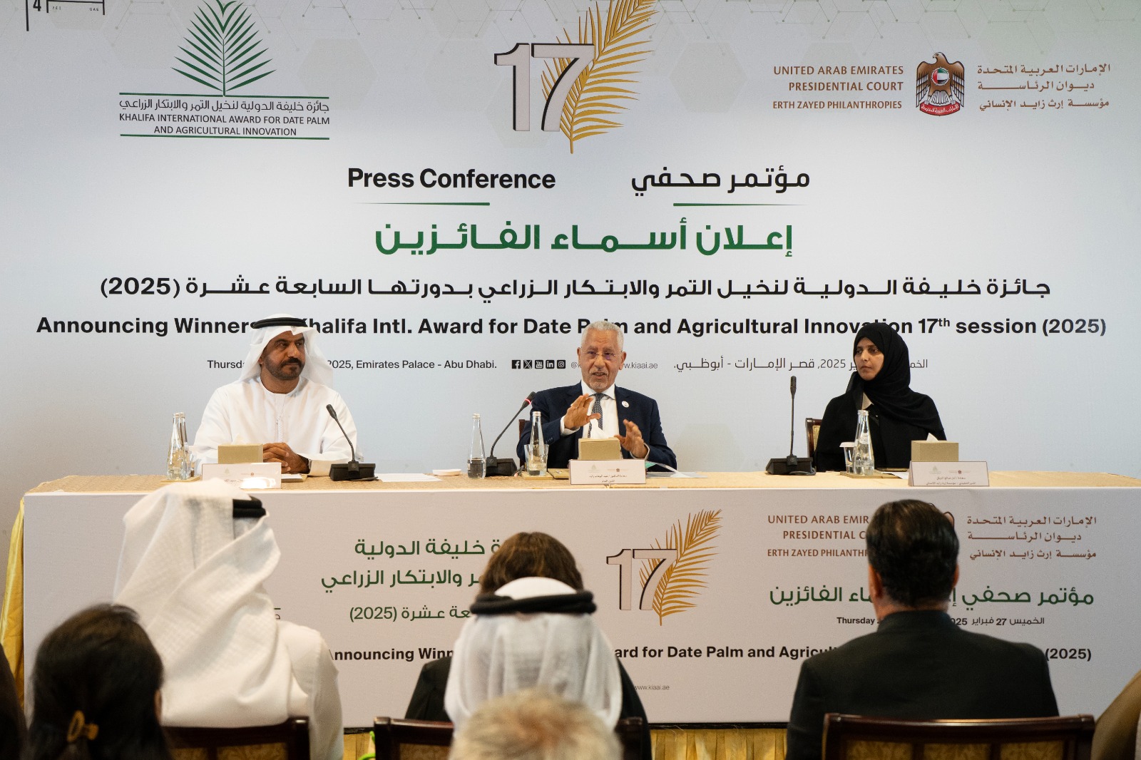 أعلن ذلك الدكتور عبد الوهاب زايد، أمين عام جائزة خليفة الدولية لنخيل التمر والابتكار الزراعي، في كلمته خلال مؤتمر صحفي عُقِدَ يوم الخميس 27 فبراير 2025 في قصر الإمارات بأبوظبي، بحضور سعادة الدكتور هلال حميد ساعد الكعبي، عضو مجلس أمناء الجائزة، وسعادة الأستاذة أمل صالح البريكي مدير تنفيذي، مؤسسة إرث زايد الإنساني، تم فيه الإعلان عن أسماء الفائزين بجائزة خليفة الدولية لنخيل التمر والابتكار الزراعي بدورتها السابعة عشرة 2025.