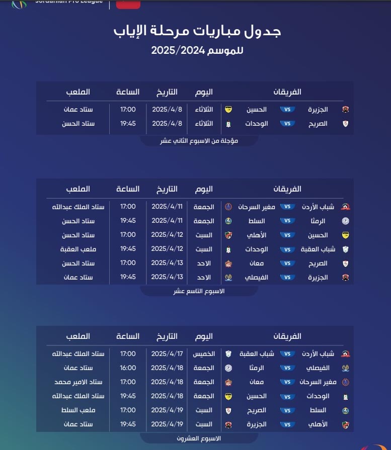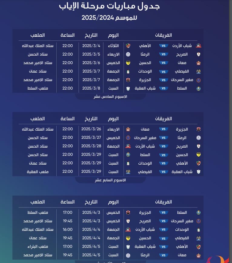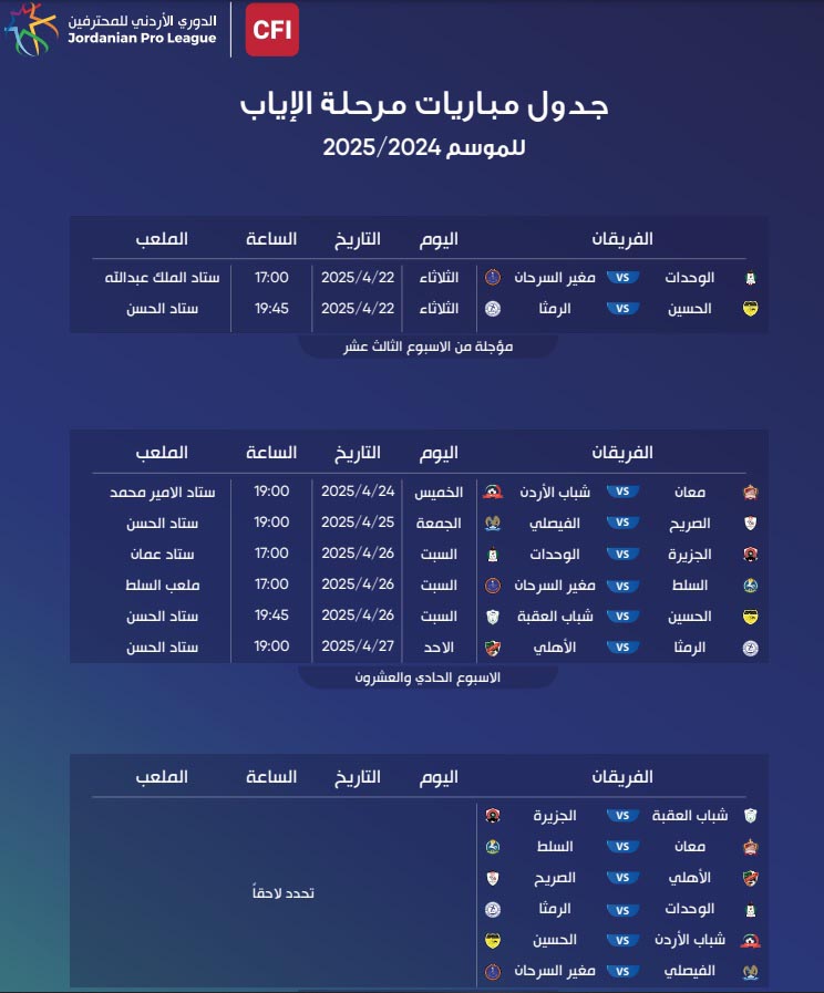 عمون - أصدر اتحاد كرة القدم جدول مباريات الأسابيع من 16 وحتى 21 من مرحلة إياب الدوري الأردني للمحترفين (CFI) لموسم 2024/2025.