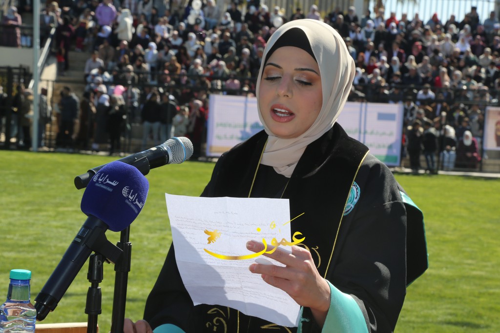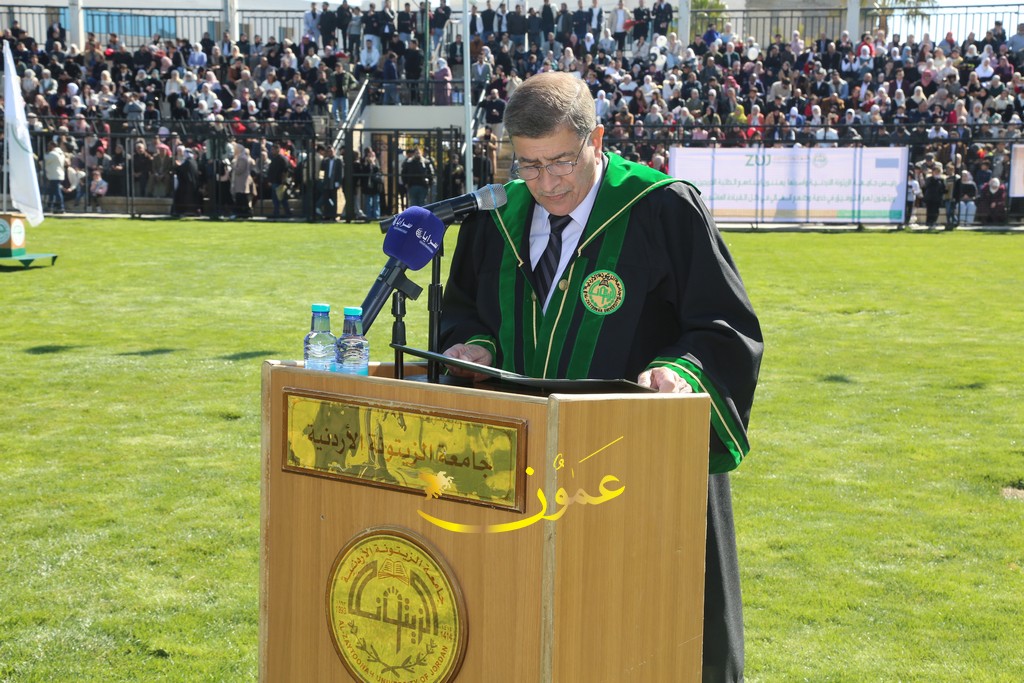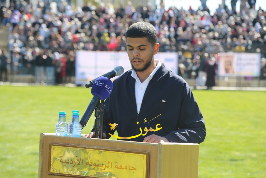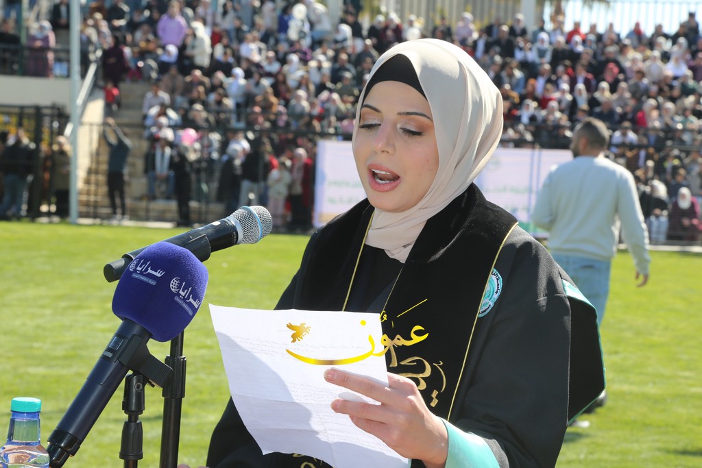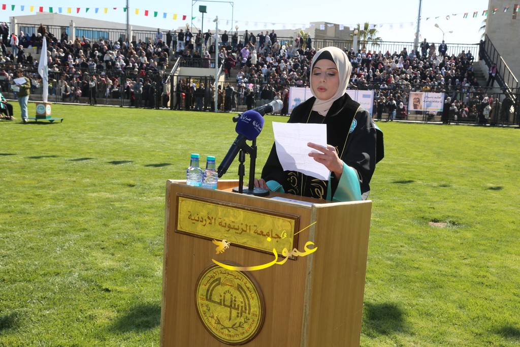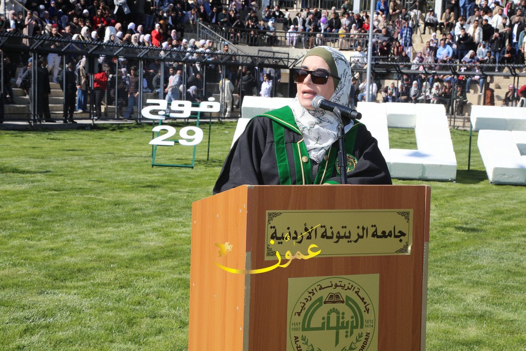 وألقت الطالبة رزان شحادة كلمة نيابةً عن الخريجين، حيث قالت: "أهنئكم بحفل تخريج دفعة جديدة من جامعة الزيتونة الأردنية، الجامعة التي تواصل التميز والعطاء. اليوم، نحتفل بتخريج شباب يحملون العلم ويعزمون على رفعة الوطن. أشكر الأساتذة الأفاضل على جهودهم، والآباء والأمهات على دعمهم المستمر. أسأل الله أن يحفظ الأردن في ظل قيادته الهاشمية الحكيمة، وأن يعم الأمن والازدهار".