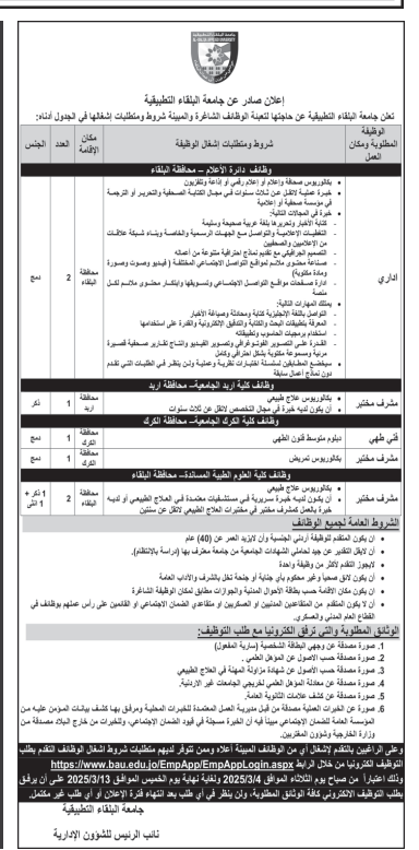 وظائف شاغرة لدى جامعة البلقاء التطبيقية