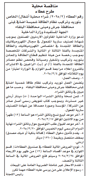 عطاء تركيب طاقة شمسية لمبنى محافظة جرش ومحافظة البلقاء