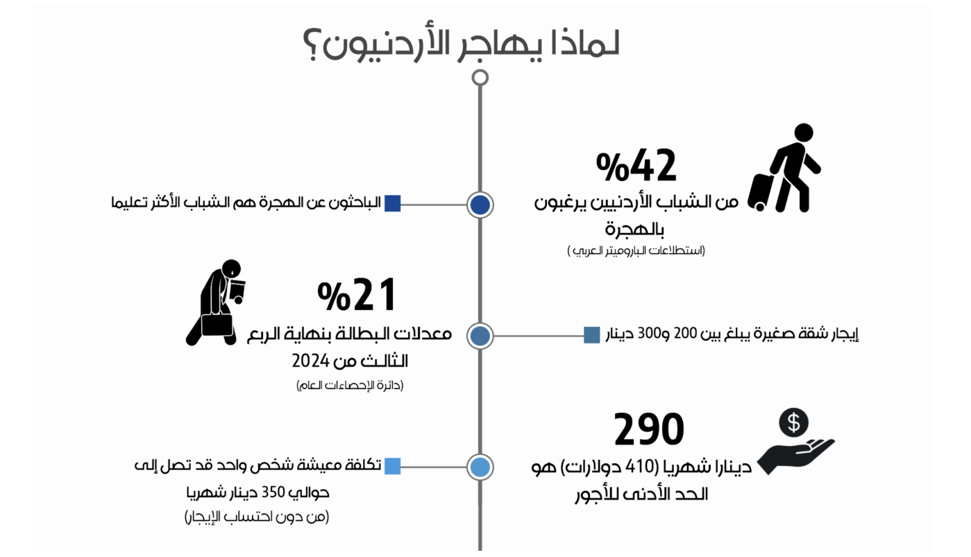استطلاعات للرأي أجرتها شبكة الباروميتر العربي، وهي شبكة بحثية غير حزبية، أظهرت أن نسبة الراغبين في الهجرة من الأردن، تعتبر الأعلى بين الدول العربية. أبو فلغة قال لموقع "الحرة" إن أعداد الراغبين في الهجرة من الأردن تضاعفت منذ 2016.