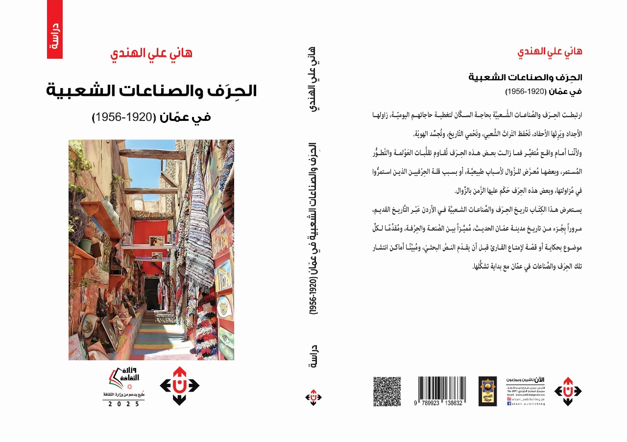 عمون - صدر حديثًا عن دار النشر الآن ناشرون وموزعون للكاتب والباحث هاني علي الهندي كتاب جديد، بعنوان "الحرف والصناعات الشعبية في عمان (1920ـ 1956)، بدعم من وزارة الثقافة، استعرض الكاتب فيه تاريخ هذه الحرف والصناعات عبر التاريخ القديم، مرورا بجزء من تاريخ عمان الحديث بما يخدم الهدف في الإشارة إلى الحرف والصناعات الشعبية التي ظهرت فيها خلال الفترة الزمنية من عام 1920ـ 1956، معتمدا على بعض المصادر والمراجع رغم قلتها، ففي تاريخ بلادنا جوانب كثيرة لم تهتم بها الدراسات والأبحاث.